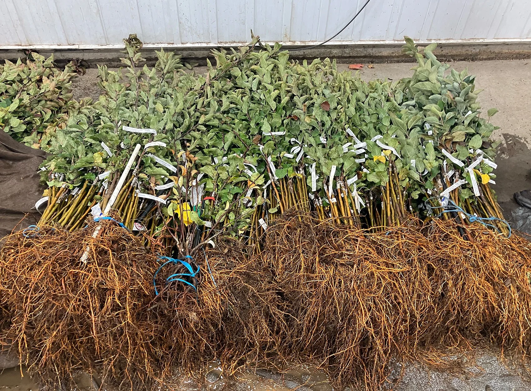 Pimeän tullen vilkaisimme vielä halliin, jossa työpäivä näytti venyvän. Kuukauden kuluttua maassa olisi kuulemma jo lunta, joten taimien (lehtineen päivineen) nosto pellosta oli aloitettu, jotta työ ehdittäisiin tekemään ennen talvea. Vartetut omenapuut välivarastoidaan ja toimitetaan myöhemmin asiakkaille. Eric esitteli myös varteoksien säilytystä, hän pitää ne –2°C lämpötilassa pakastimessa/jääkaapissa kosteaan tyynyliinaan ja muoviin käärittynä, jotta ne pysyvät lepotilassa kevääseen saakka.