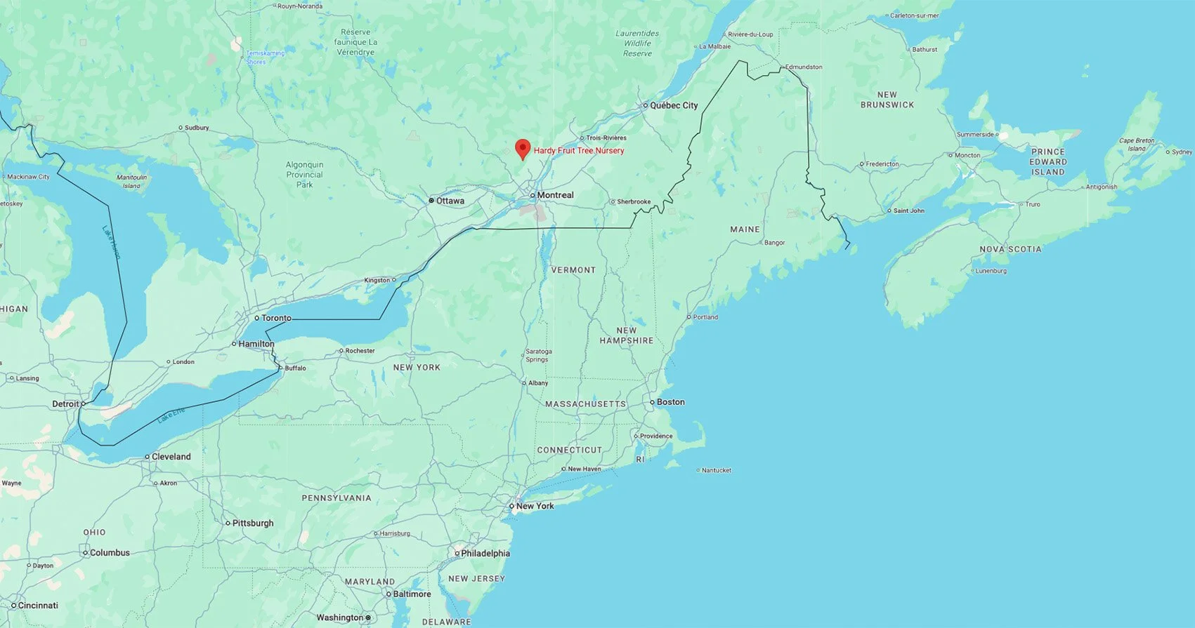 Taimisto sijaitsee Kanadan menestymisvyöhykkeellä 4b, lähellä Rawdonin pikkukaupunkia. Eric kertoi, että joka talvi on öitä jolloin pakkanen laskee –30°C asteeseen. Noin kerran kymmenessä vuodessa on –40°C pakkasia ja muistaapa hän myös vuoden, jolloin pakkasta oli lähes –50°C – todella kylmää seutua siis! Syksyn ensimmäiset pakkaset tulevat normaalisti syyskuussa ja tulevaksi yöksikin oli luvattu hallaa. Kasvukauden tehoisaa lämpösummaa kertyy keskimäärin vain 1400 astepäivää (GDD+5), saman verran kuin eteläisimmässä Suomessa tai jopa vähemmän. Maan pH on luontaisesti kuuden kieppeillä.