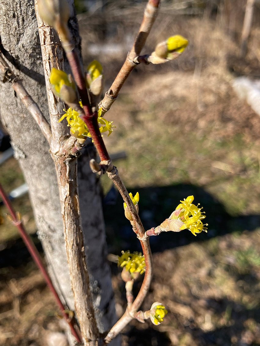 Punamarjakanukka (Cornus mas) 'Elegantnyj'. Kukinta aluillaan 21.4.2023 Laitilassa.