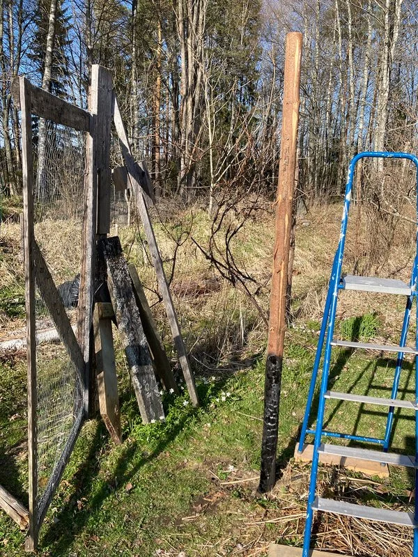 Koska alueella liikkuu runsaasti hirvi- ja jäniseläimiä on kaksi metriä korkea verkkoaita keskeinen osa syötävää metsäpuutarhaani. Tolpat olen tehnyt itse lähinnä kuusesta. Ne ovat tyvihalkaisijaltaan noin 10 cm ja pituudeltaan 280 cm, josta reilu 200 cm maan päällä, tolppien väli on noin kolme metriä. Tolpan tyviosan terotan ja hiillostan, jotta se kestäisi lahoa pidempään. Aika vaihtelevasti näyttää tolppa kestävän, osa lahoaa muutamassa vuodessa, osa on ehjiä vielä 12 vuoden jälkeen. Vaihdoin silti nyt ehjiäkin vanhempia tolppia, koska ne tuntuivat haurailta ja vierestä piti katkenneita vaihtaa. Katajasta saa kestävimmät tolpat jos sitä on tarjolla ja haapa on kuulemma hyvä myös, mutten ole sitä kokeillut.
